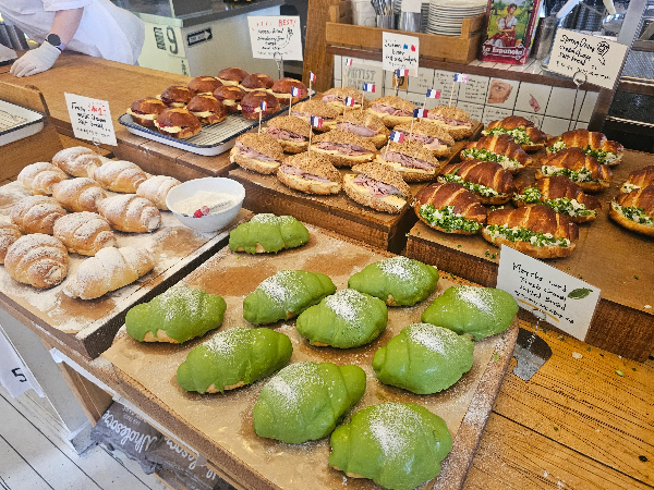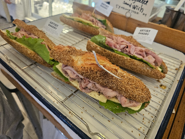 소금빵이 정말 다양한 종류가 있더라고요. 기본 소금빵은 물론이고, 얼그레이, 초콜릿, 말차, 크림치즈, 코코넛, 블루베리, 갈릭버터참깨, 시나몬, 감자치즈, 프렛즐, 바질페스토, 통밀, 감자버터 등 소금빵들도 있고요. 바게트 종류도 여러 가지, 그리고 소금빵으로 만든 샌드위치도 있었어요!
