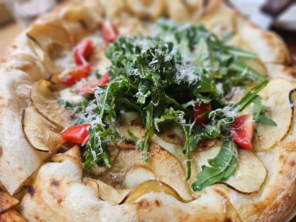 오른쪽은 사과 고르곤졸라 피자입니다.